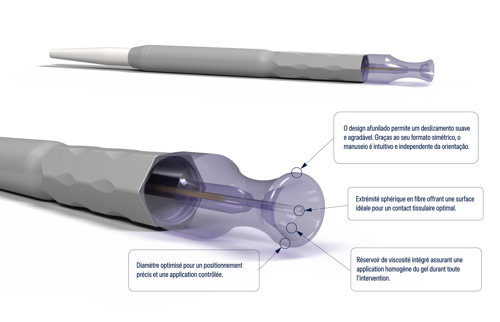 Ao contrário de sondas convencionais, a sonda μCPC permite um manuseio confortável sem necessidade de orientação — uma grande vantagem em aplicações clínicas. Tão simples quanto usar uma caneta.